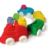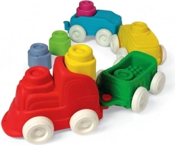 La locomotive et les trois wagonnets se connectent et se séparent facilement, permettant aux enfants de créer leurs propres compositions. Les roues assurent un mouvement fluide du train, ce qui encourage le jeu actif et stimule l’imagination. Les blocs peuvent être insérés dans les wagonnets ou empilés en tours stables – idéal pour les premières constructions et empilements.