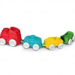La locomotive et les trois wagonnets se connectent et se séparent simplement. Les roues assurent un mouvement fluide du train et encouragent le jeu actif ainsi que la création d’histoires.
