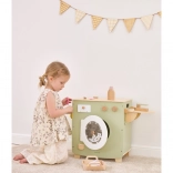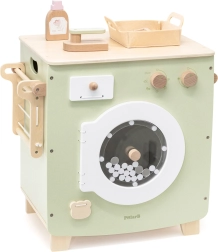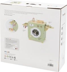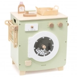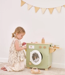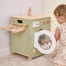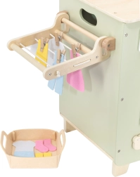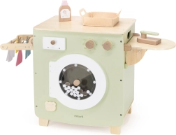 Cette machine à laver en bois de haute qualité, dans un doux vert pastel avec des accents naturels, offre aux enfants une expérience authentique de lavage, séchage et repassage. Les boutons de commande, la porte transparente et l’étendoir latéral pliant avec pinces garantissent de longues heures de jeu utile et de développement des compétences.