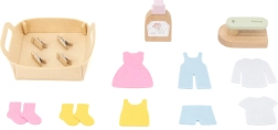 Le set comprend également des accessoires tels que la lessive, un panier à linge, des vêtements en feutre et un fer à repasser en bois. Grâce à sa fabrication robuste en bois et à ses bords lisses, le jouet est sûr et résistant pour un jeu quotidien.