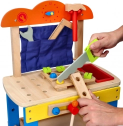 Grâce à ses dimensions compactes et à la hauteur de 34 cm jusqu’au plateau de travail, l’atelier est idéal pour la chambre d’enfant. Fabriqué en bois et livré avec un riche ensemble d’outils, il encourage l’autonomie, la patience et la pensée logique.