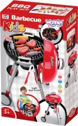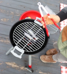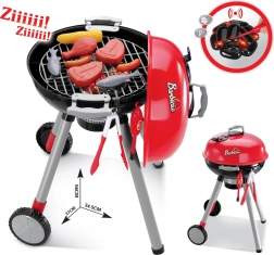 Le set contient tout le nécessaire pour imiter un barbecue familial : rainures sur la grille, large sélection de aliments en plastique (saucisses, steaks, poulet, poissons, maïs, aubergine), ustensiles, petites assiettes, gobelets et même un moulin à poivre. Le couvercle amovible protège la grille après la « grillade », et grâce aux roulettes et à la poignée, les enfants déplacent facilement le barbecue sur la terrasse ou dans leur chambre.