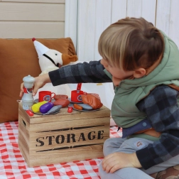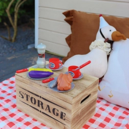Saucisses, steaks, poulet, poissons, maïs, aubergine, assiettes, couverts, gobelets, moulin à poivre, pinces et allume-feu – tout dans un seul coffret pour des heures de jeu.