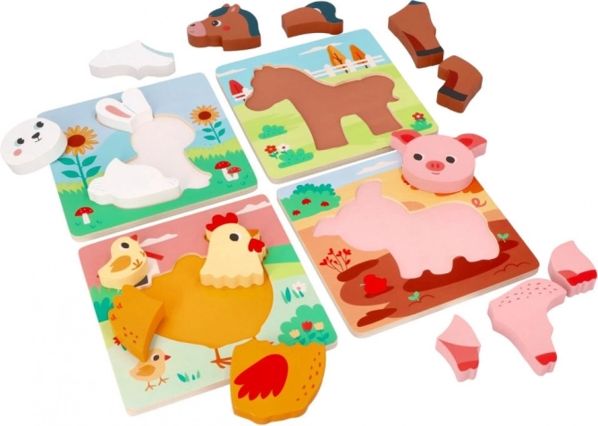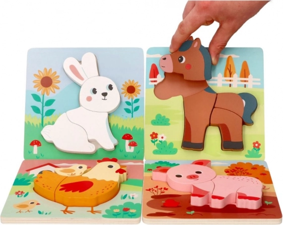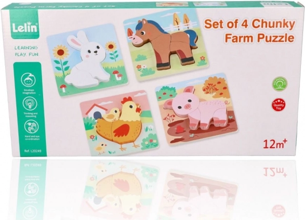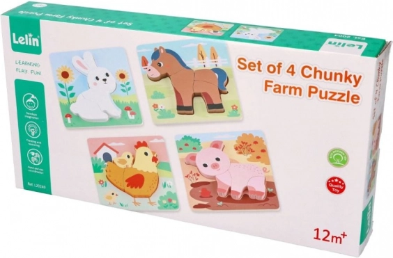 Découvrez l’apprentissage ludique avec cet ensemble de quatre puzzles en bois sur le thème de la ferme – lapin, cheval, poussin et petit cochon. Chaque puzzle possède des pièces « chunky » solides, idéales pour les petites mains, et des supports colorés qui encouragent la reconnaissance des formes et des animaux.