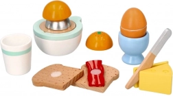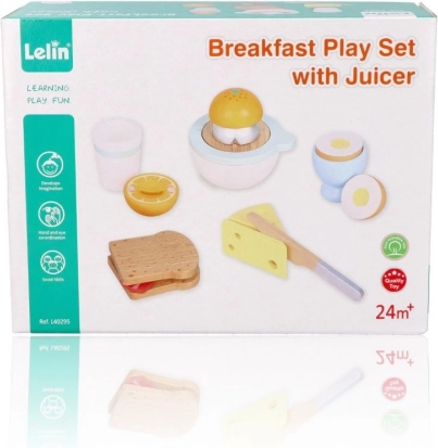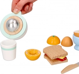 Ensemble de petit-déjeuner en bois pour petits chefs offrant tout le nécessaire pour un jeu de cuisine réaliste – toasts, œuf à la coque, fromage, presse-agrumes manuel avec orange, tasse et couteau en bois sécurisé. Dès 24 mois, il développe la motricité fine, la créativité et le jeu de rôle avec une fabrication de qualité et durable.