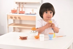 Manipuler l’œuf à la coque, les toasts et le petit couteau entraîne la préhension, la coordination et l’imagination lors des jeux de rôle.