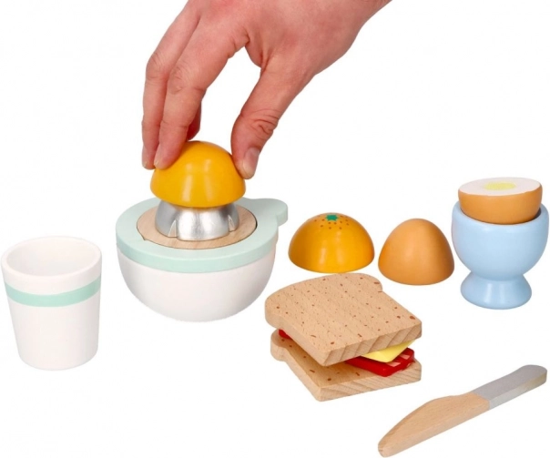 - Accessoires de petit-déjeuner complets : toasts, fromage, œuf à la coque, tasse, couteau en bois et presse-agrumes manuel fonctionnel avec orange.