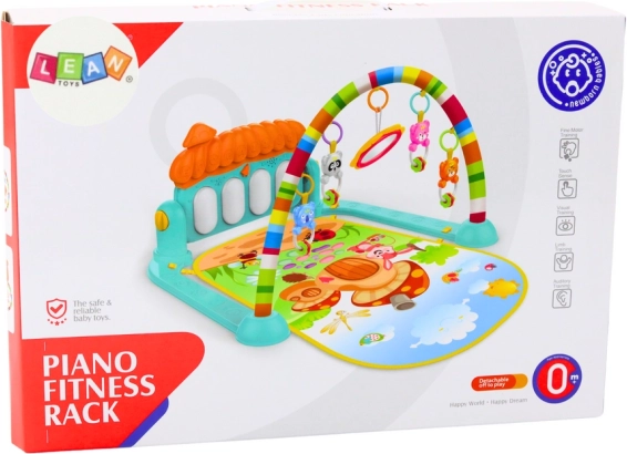 Le tapis coloré et doux assure confort et sécurité pendant le jeu. Le bébé peut donner des coups de pied avec ses pieds sur le piano intégré à la base du tapis, qui émet des sons joyeux, ou jouer du piano avec ses mains, développant ainsi sa musculature et sa coordination œil-main. Au-dessus du tapis se trouve une arche avec des jouets à saisir et à secouer, ce qui stimule la vue et le toucher de l’enfant.