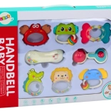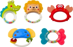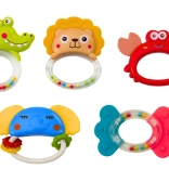 Le set offre des hochets en forme de crocodile, lion, crabe, éléphant et poisson, aux couleurs vives pour stimuler la perception visuelle.