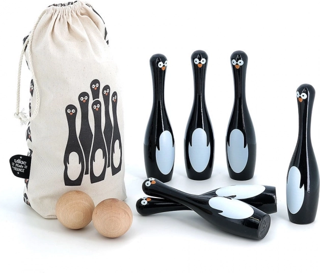 Le set comprend six quilles en forme de pingouins et deux boules en bois. Ce jeu non seulement offre des heures de plaisir, mais aide aussi à développer la motricité et l'agilité. Les quilles ont été fabriquées en France en utilisant un procédé traditionnel de laquage, garantissant une haute qualité et durabilité.
