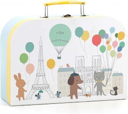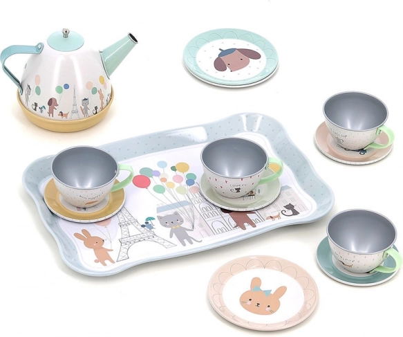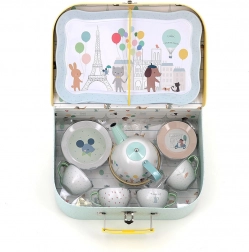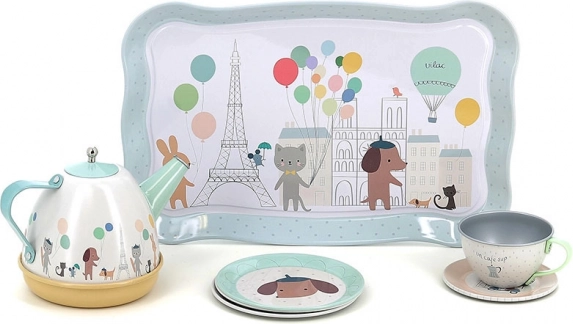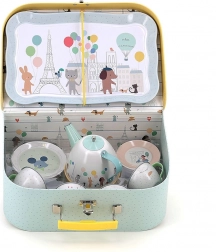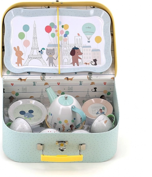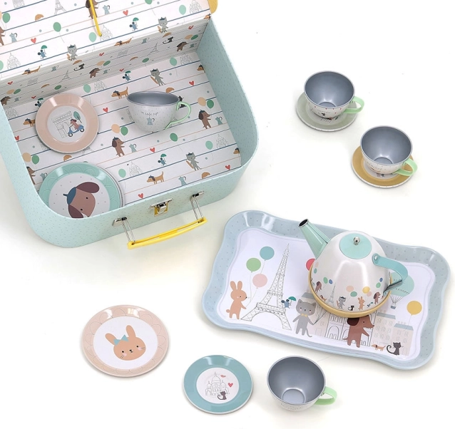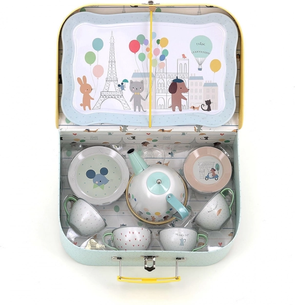 Ce charmant ensemble comprend 14 pièces illustrées par Sarah Betz, évoquant l’ambiance de Paris grâce à des couleurs et motifs délicats. Le set inclut un plateau, une théière et quatre tasses avec soucoupes, idéal pour des goûters-thé ludiques. Grâce à la valisette pratique, vous pouvez transporter facilement le set et l’utiliser même en voyage.