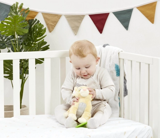 Adorable lionceau SIMBA du dessin animé DISNEY Le Roi Lion, douce peluche d’éveil avec anneau de dentition en forme de feuille, ventre texturé et rubans sensoriels. Favorise le développement des sens et de la motricité fine, idéale dès la naissance pour câlins et premières découvertes.