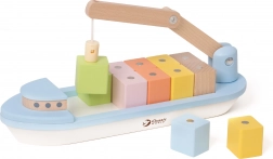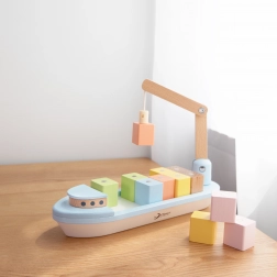 Ce bateau cargo en bois est un jouet bien pensé pour les enfants dès 2 ans. Il comprend 12 blocs magnétiques et un bateau stable avec une grue mobile qui permet de déplacer facilement les « conteneurs ». Grâce à ses formes lisses et à son bois de qualité, le jeu est sûr et agréable au toucher.