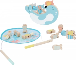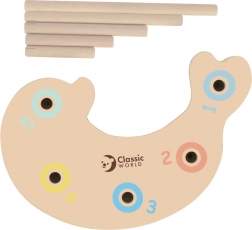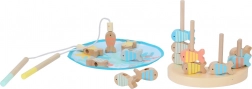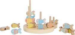 Placez les poissons pêchés sur les chevilles selon les couleurs, les motifs ou le nombre de trous. Le jeu stimule la logique et les premiers calculs.