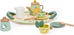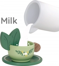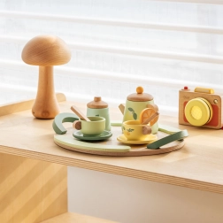 Théière, tasses, soucoupes, cuillères, pots à lait et à sucre, ainsi qu’un grand plateau – le tout assorti dans de délicates couleurs pastel pour des scénarios de jeu sans fin.