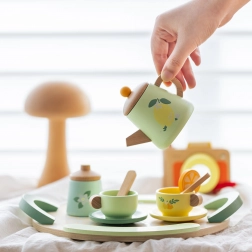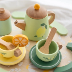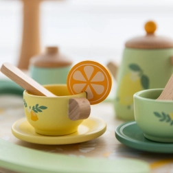 Offrez aux enfants un rituel de thé magique avec cet élégant service en bois aux tendres nuances pastel. Le set, orné de motifs fruités et floraux, comprend une théière, des tasses avec soucoupes, des cuillères, des pots à lait et à sucre, ainsi qu’un grand plateau avec poignées pour un transport facile.