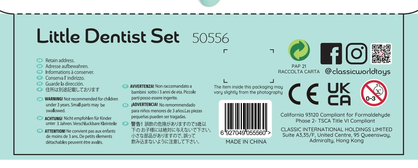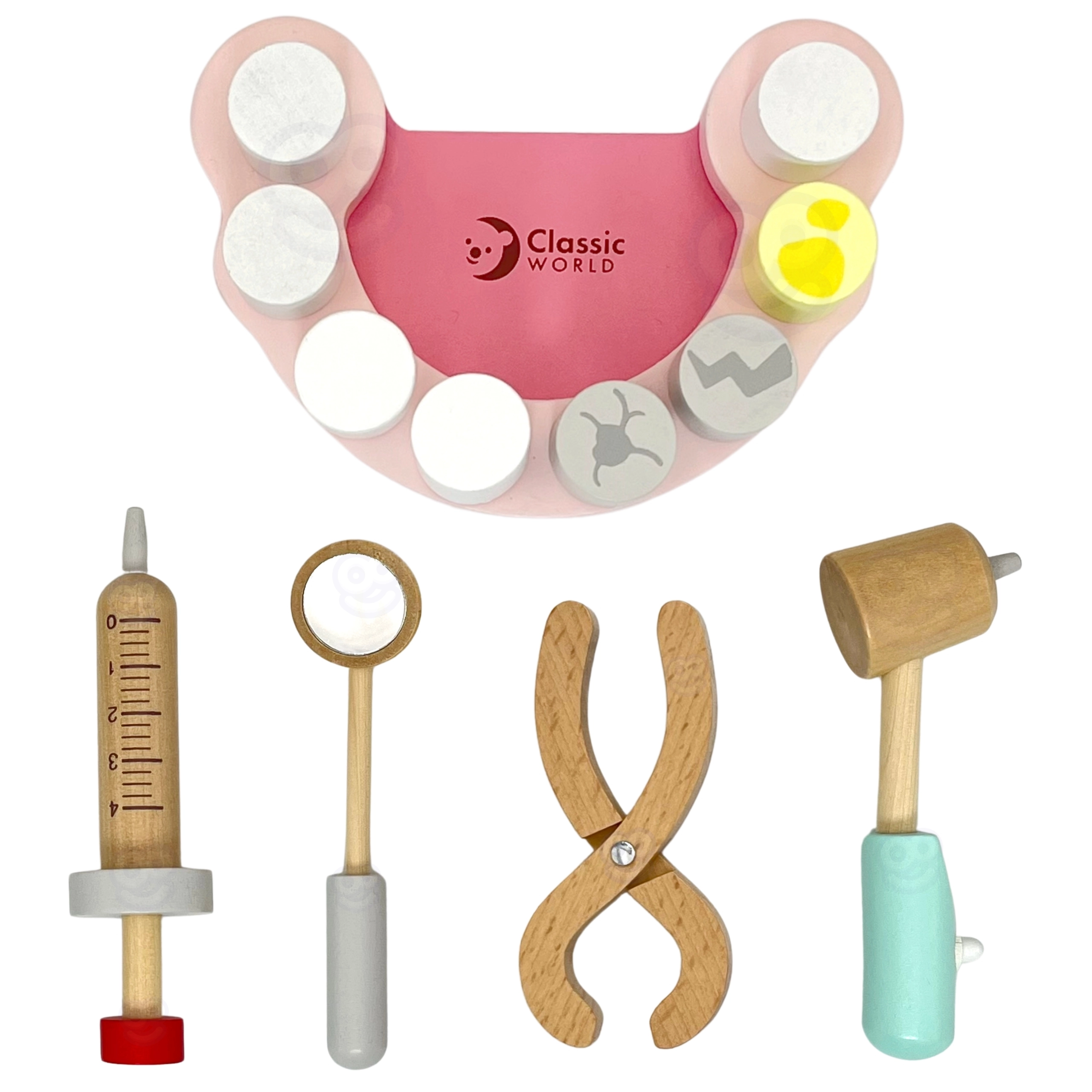 Le kit de petit dentiste Classic World offre aux enfants un espace sûr pour découvrir le monde de la dentisterie. Grâce aux instruments en bois réalistes et au modèle de gencives, les enfants apprennent comment se déroule un examen, pourquoi la soin des dents est important et ce qui arrive lorsqu’on oublie l’hygiène. Le jeu renforce naturellement les compétences de communication et la confiance en soi.