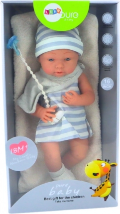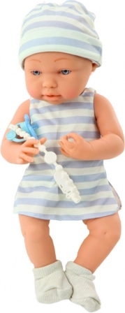 Poupée Bébé est habillée d'une tenue blanc-bleu, d'un bavoir, de chaussettes et d'un bonnet, lui donnant un charme unique. Les bras et jambes articulés permettent un jeu interactif qui développe les compétences manuelles et la créativité de l'enfant. Les traits réalistes du visage ajoutent à l'authenticité et enrichissent les aventures des enfants.