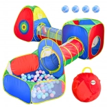 La tente triangulaire possède une cible de tir avec des balles à velcro incluses dans l’emballage. La tente carrée a deux entrées et relie les tentes à l’aide de tunnels, permettant aux enfants de passer librement d’une tente à l’autre. La piscine à balles est équipée d’un panier de lancer.