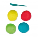L'image montre quatre boules de pâte à modeler colorées - jaune, rouge, verte et turquoise. Un jouet créatif pour modeler et façonner en différentes formes.