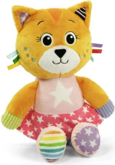 Le chat en peluche se distingue par son apparence riche en couleurs et ses textures variées qui stimulent les sens des enfants.