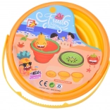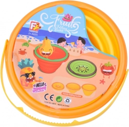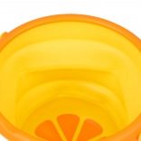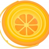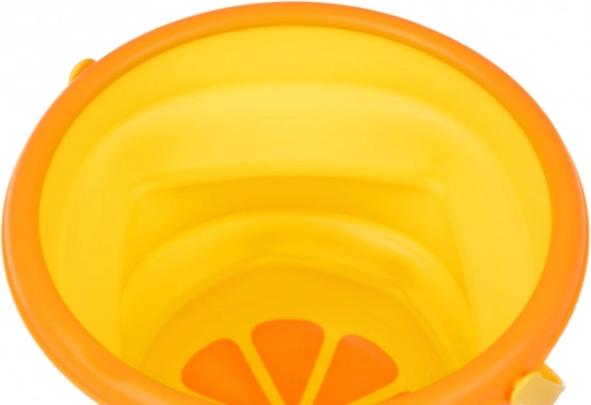 Le fond avec motif de tranche d’agrume et les couleurs jaune‑orange vives attirent les enfants pour jouer à la plage comme au bac à sable.