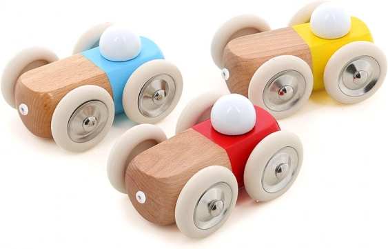 La voiture est fabriquée en bois laqué, une alternative plus respectueuse de l’environnement que les jouets en plastique.