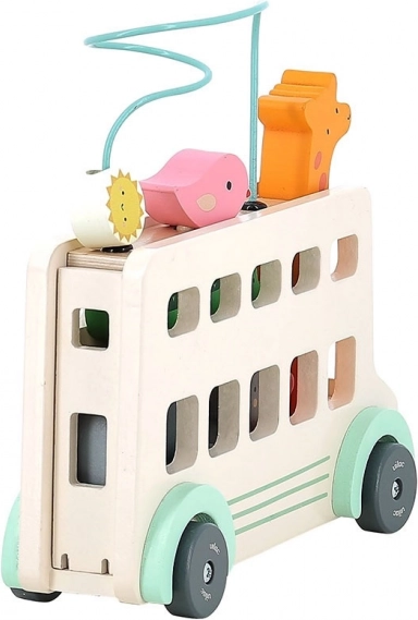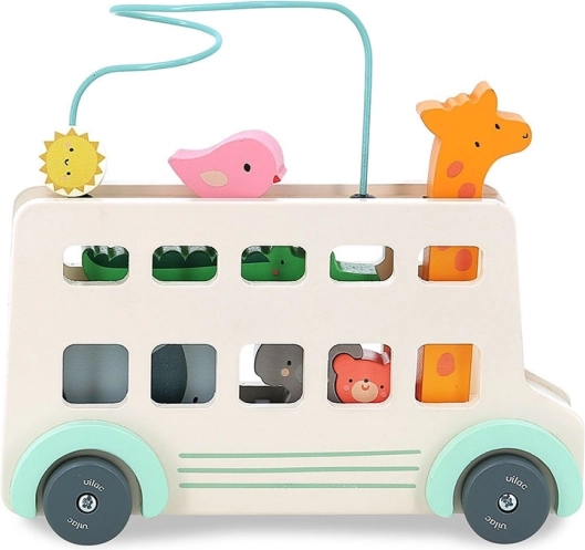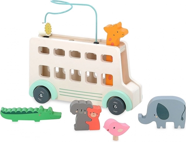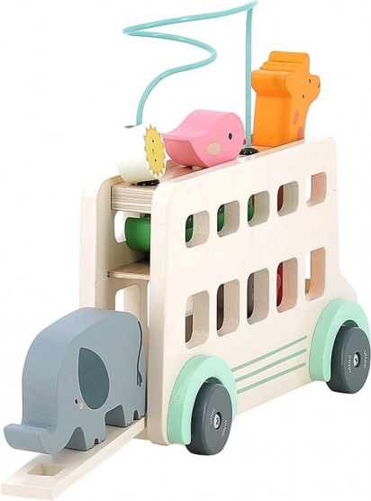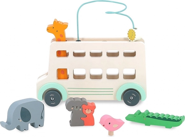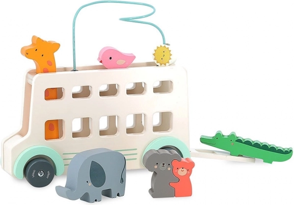 Le bus en bois offre de nombreux éléments interactifs comme des fenêtres découpées, des figurines d'animaux colorées et un labyrinthe de perles sur le toit, qui stimulent la créativité.