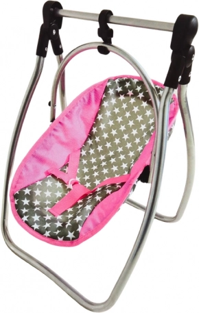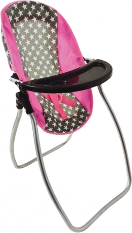 Ce set pratique combine deux jouets appréciés en un seul: en un instant, transformez la balançoire en chaise haute grâce à l’arceau supérieur amovible et à la tablette fournie. Le cadre métallique robuste, les connecteurs en plastique et la housse textile de qualité à motif étoiles garantissent sécurité et confort pour la poupée.
