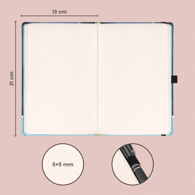 Carnet élégant avec le motif de l’œuvre Alfons Mucha – Luna et couvertures rigides. Il offre un quadrillage pointillé pour des notes créatives, une fermeture élastique, une poche pour petits objets et un porte-stylo. À l’intérieur, 172 pages sur un papier jaune agréable au format 13 × 21 cm – idéal pour la planification, le bullet journal et les croquis.