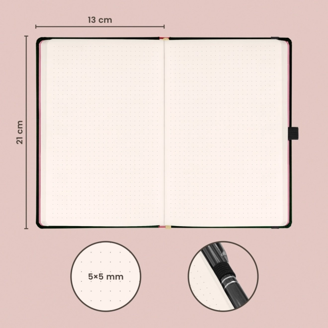 Les pages pointillées offrent la liberté pour une planification précise, le dessin et la création de notes claires. La fermeture élastique maintient tout en place, la poche arrière garde les petits objets en sécurité et le porte-stylo vous assure d’avoir toujours votre stylo à portée de main.