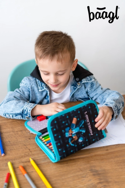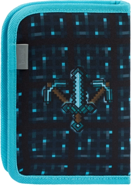 Le motif Minecraft avec des haches pixelisées confère à cette trousse une ambiance de jeu unique.