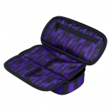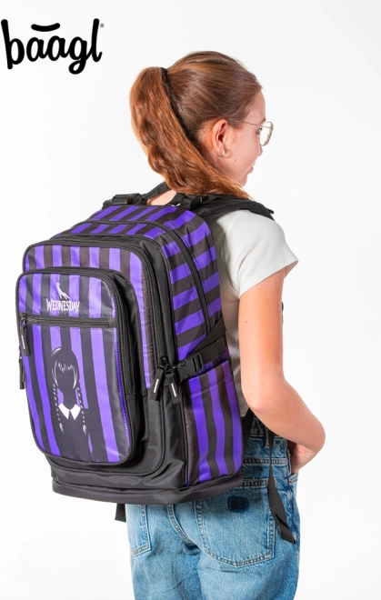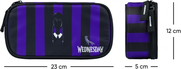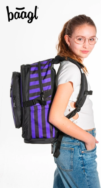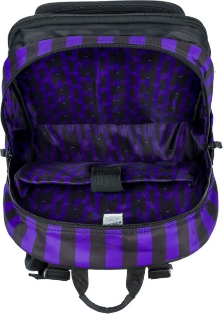 Le set Cubic Wednesday comprend un sac à dos stylé, une trousse pratique et un sac pour chaussures, le tout dans un design moderne à rayures noires et violettes. Le sac à dos est conçu pour répondre aux besoins ergonomiques, tandis que la trousse et le sac assurent l’organisation des fournitures scolaires et des activités de loisirs.
