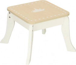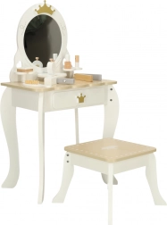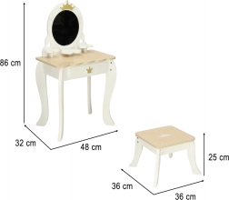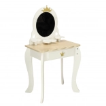 Un tabouret est également inclus pour permettre de s’asseoir confortablement. Le produit est entièrement réalisé en bois finement poncé, recouvert de peintures non toxiques, avec un design élégant blanc et doré qui séduira comme décoration de chambre d’enfant.