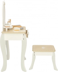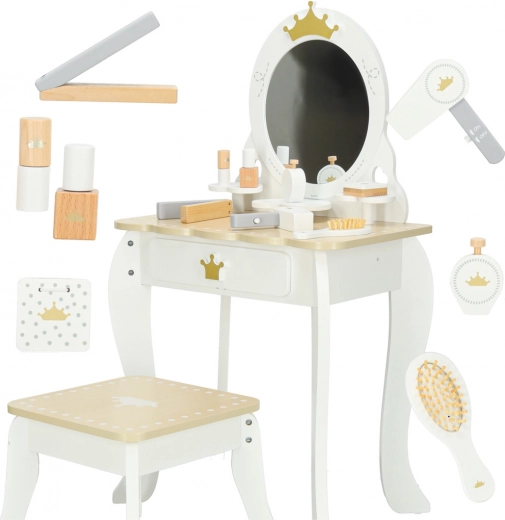 La coiffeuse est équipée d’un grand miroir rond, d’étagères et d’un tiroir pour les accessoires de beauté, ainsi que d’un tabouret pratique. Sont inclus des accessoires tels qu’un peigne, un sèche-cheveux, un fer à lisser, une palette de fards à paupières, un parfum, un vernis à ongles et un rouge à lèvres. Tous les accessoires cosmétiques sont des imitations, évitant ainsi tout désordre.