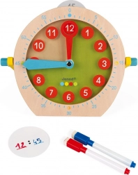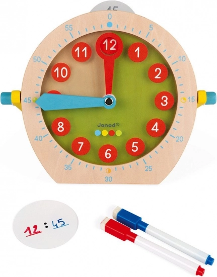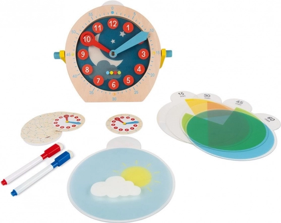 - Horloge en bois, 14 cartes effaçables, 2 feutres colorés