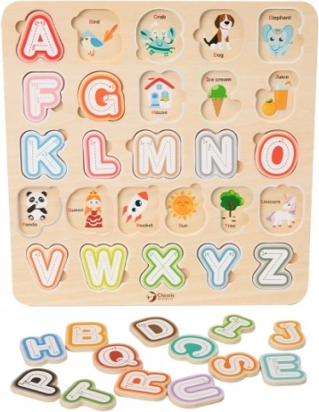 Un jeu à la fois ludique et éducatif pour les tout-petits : un puzzle encastrable en bois avec alphabet qui développe la motricité fine, la logique et la reconnaissance des lettres. Sous chaque lettre se cache une image en anglais, ce qui permet aux enfants d’acquérir naturellement les bases de l’anglais dès le plus jeune âge.
