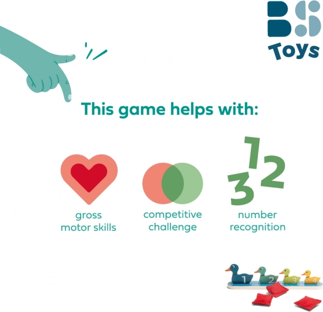 « Des canards en file » est un jeu rapide et accrocheur pour les plus petits, qui séduit par des règles simples et un amusement actif. Les joueurs alignent d’abord les canards puis essaient de les renverser avec des lancers précis de petits sachets. Le jeu soutient parfaitement la coordination œil‑main et apprend aux enfants la patience ainsi que la concentration.