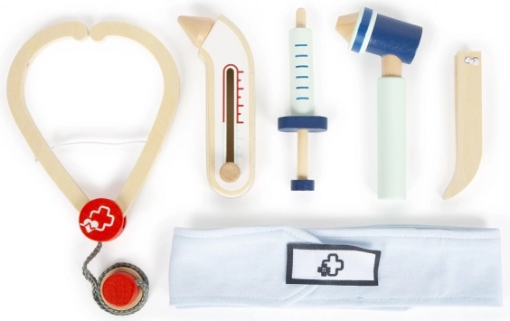 Le set complet de 6 pièces comprend un stéthoscope, une seringue, un thermomètre, un otoscope, une pince et un bandage – tout est adapté aux petites mains et à un jeu en toute sécurité.
