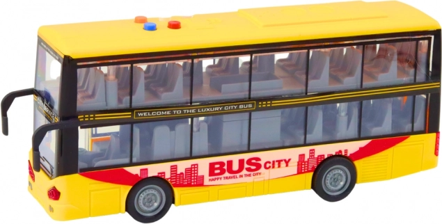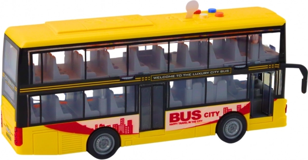 L’autobus de couleur jaune iconique reproduit fidèlement un véritable double-decker touristique. Les enfants peuvent déclencher le klaxon, le bruit du moteur et observer les lumières clignotantes, renforçant le réalisme du jeu. La propulsion à inertie garantit une conduite fluide – une simple poussée et le bus s’élance.