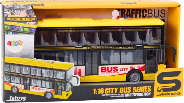 Un autobus à impériale réaliste à l’échelle 1:16 ravira les jeunes fans de véhicules urbains. Il offre des effets lumineux et sonores, une propulsion à inertie et des portes ouvrantes. Grâce à son plastique résistant et à sa couleur jaune vive, il est idéal pour un jeu imaginatif à la maison comme en déplacement.