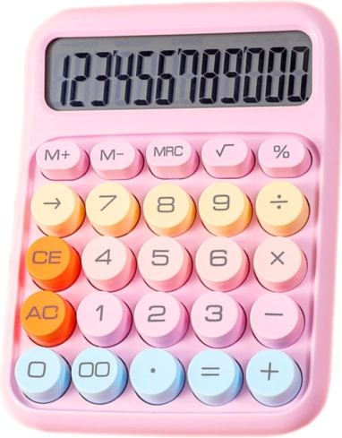 La calculatrice est de couleur violette, ce qui lui confère une apparence élégante et moderne. Elle possède de grandes touches confortables de différentes couleurs : rose, bleu, jaune et orange, facilitant une saisie rapide et intuitive.
