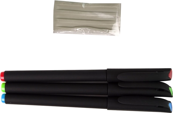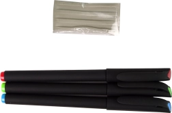 Le kit comprend 3 marqueurs colorés et une pâte de fixation qui maintient les pochoirs sur le papier. Cela évite tout glissement et garantit des lignes nettes sans bavures.