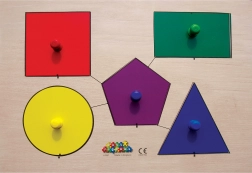 Les enfants apprennent à reconnaître différentes formes et couleurs grâce à cinq formes colorées et leurs trous précis dans le plateau.