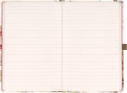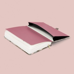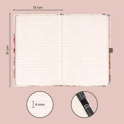 Élégant carnet NOTIQUE au motif de fleurs poudrées, au format pratique 13 × 21 cm, offrant 172 pages pointillées sur papier jaune, couverture rigide, fermeture élastique, boucle pour stylo et poche intérieure – idéal pour journal, notes et planification.