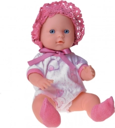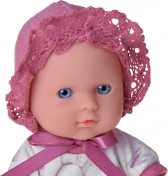 Yeux bleus, bonnet rose et tenue blanc‑rose avec petit lapin. Membres articulés et matériaux résistants pour de longues heures de jeu.