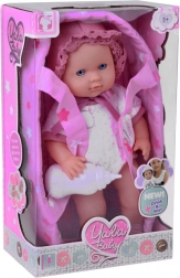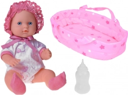 Poupée en tissu bébé dans porte-bébé boit et fait pipi avec biberon 30 cm