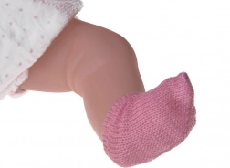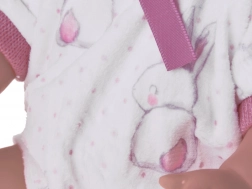 La poupée a de charmants yeux bleus, un bonnet rose, une tenue blanc‑rose avec un adorable motif de lapin et des chaussons/chaussettes roses. Les bras et les jambes sont articulés, le corps est en plastique résistant au toucher agréable, assurant un entretien facile et une longue durabilité.