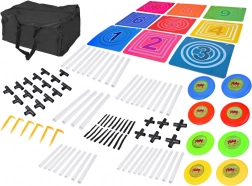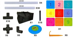 - Cible avec cases, 8 disques, sac, tubes 40 cm × 4, tubes 35 cm × 38, connecteurs × 28, bandes auto-agrippantes × 18, piquets en plastique × 6