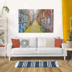 Une ruelle avec graffitis et vélos crée une image vive et dynamique qui attire le regard dès le premier coup d’œil et, une fois assemblée, orne à merveille votre intérieur.